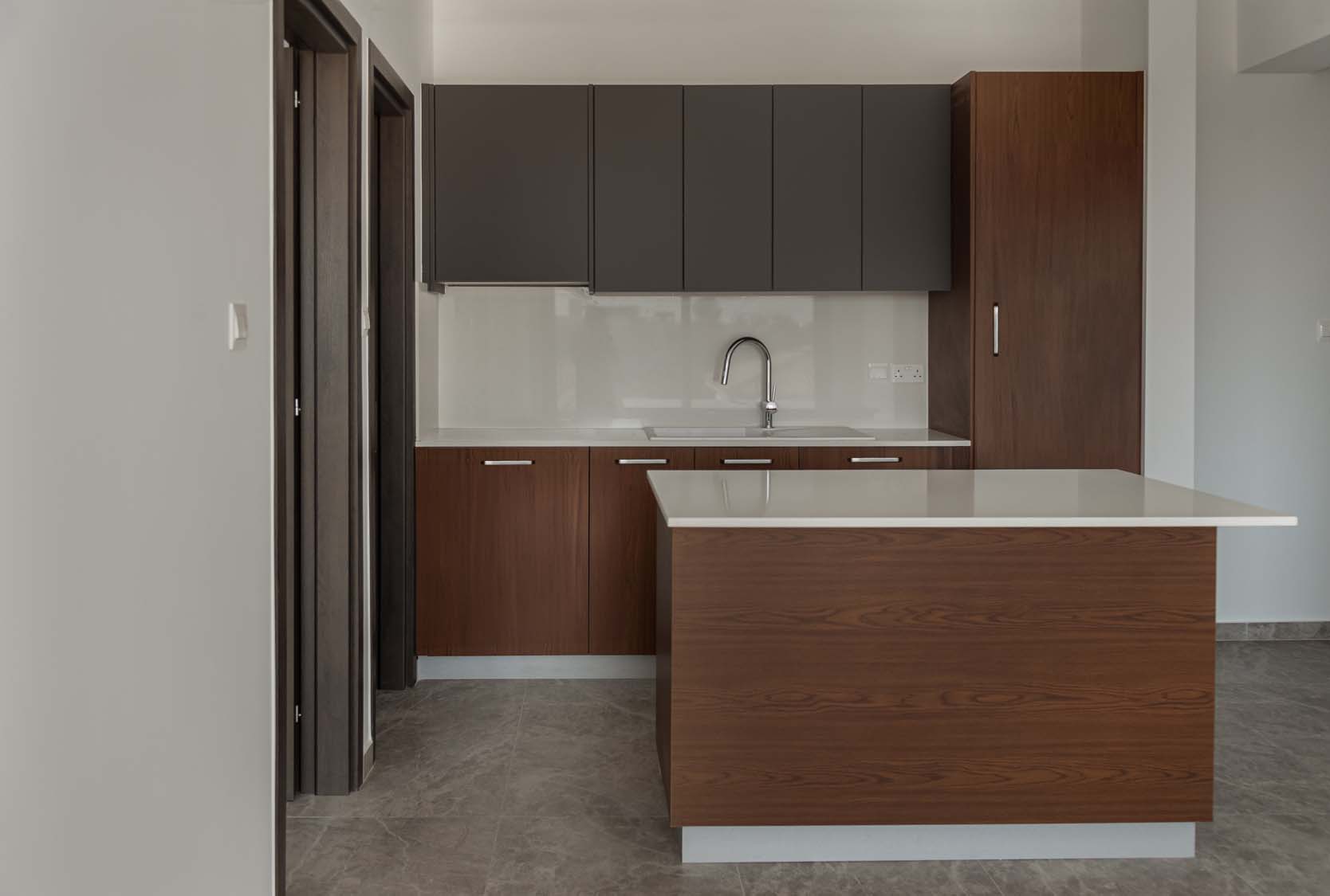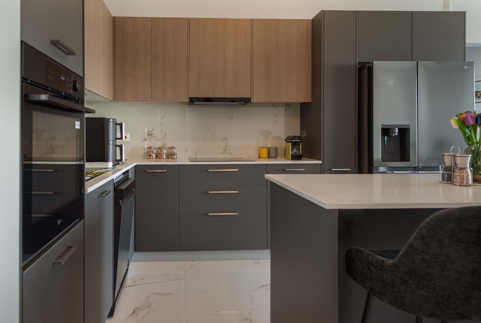 Kitchen: Grey Matt (Overhead Cabinet) and Dark Oak (Base Cabinet); Granite: Bianco Sal