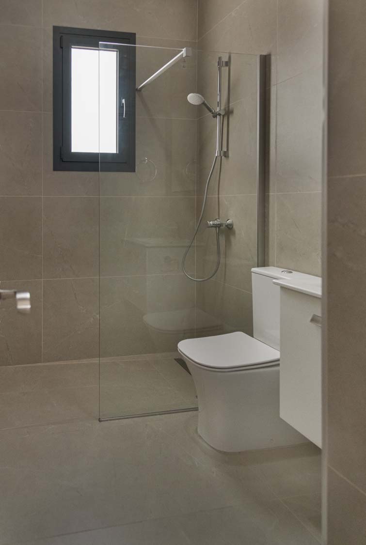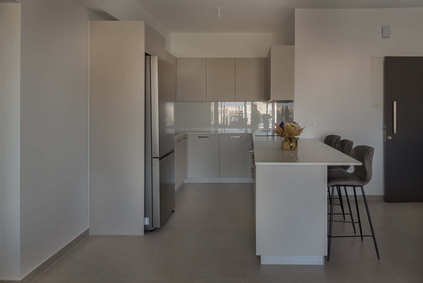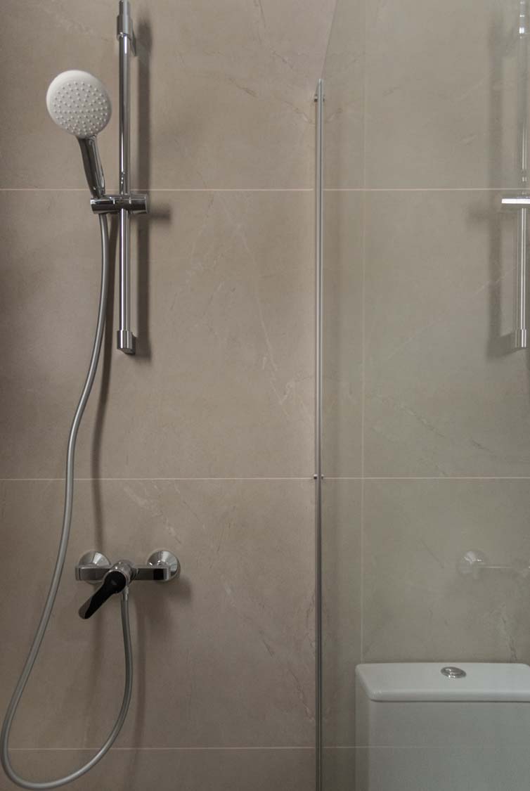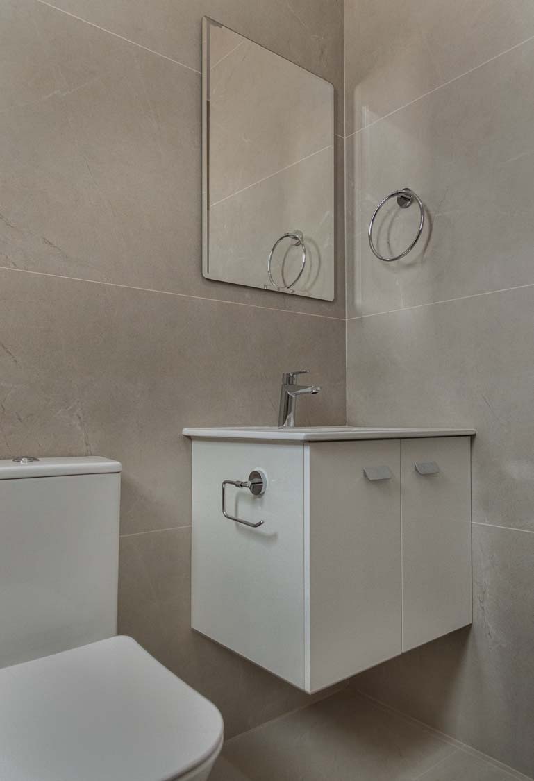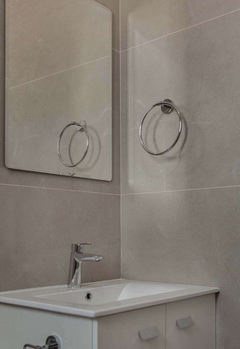 Ceramic tiles: EM Verona Marfil Matt 60x120; Kitchen: Light Mocha; Granite: Snow White; Kitchen Mixer: Ravelli 3-way Pull Out; Toilet: Ravelli Riana Back-to-Wall;Bathroom Mixers: Grohe Bauedge Bathroom Accessories: Grohe; Bathroom Cabinets: Vanity Unit White