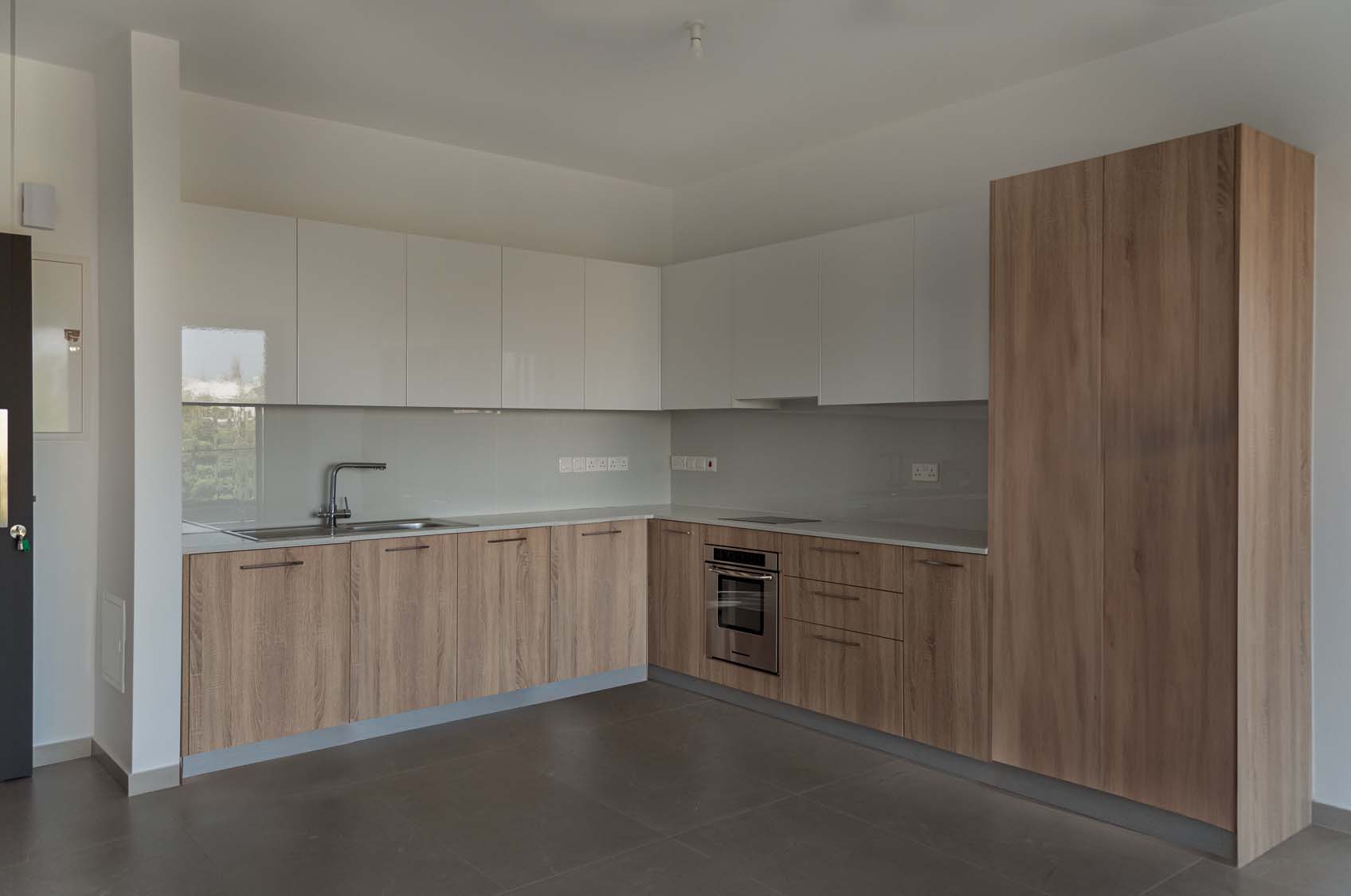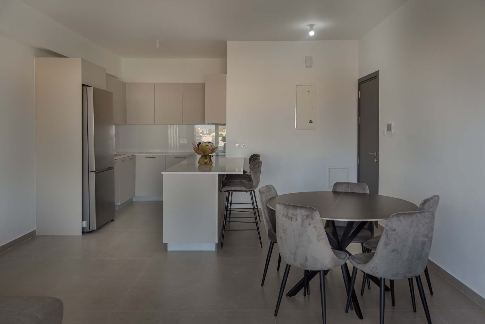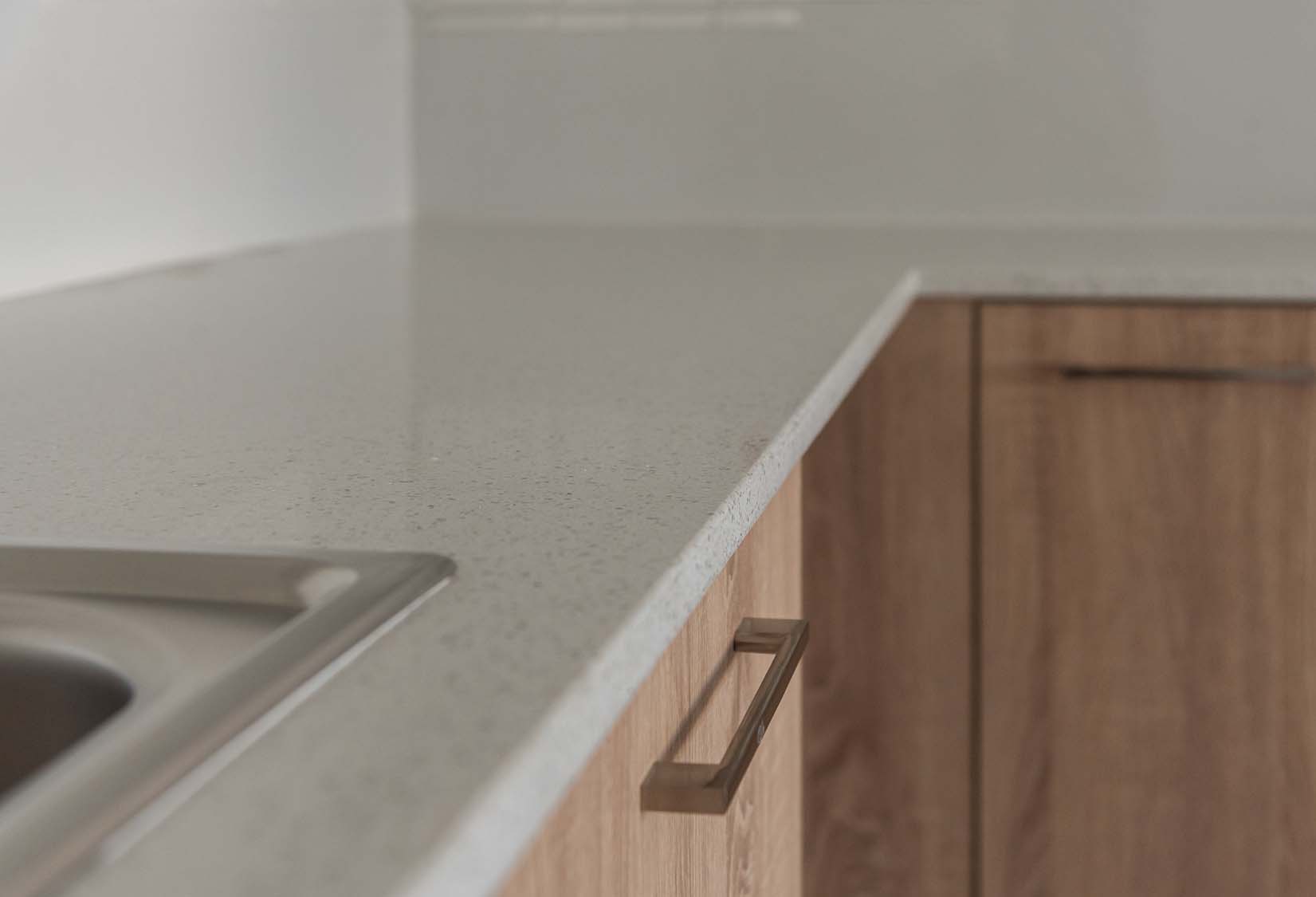 Ceramic tiles: EM Verona Marfil Matt 60x120; Kitchen: Light Mocha; Granite: Snow White; Kitchen Mixer: Ravelli 3-way Pull Out; Toilet: Ravelli Riana Back-to-Wall;Bathroom Mixers: Grohe Bauedge Bathroom Accessories: Grohe; Bathroom Cabinets: Vanity Unit White