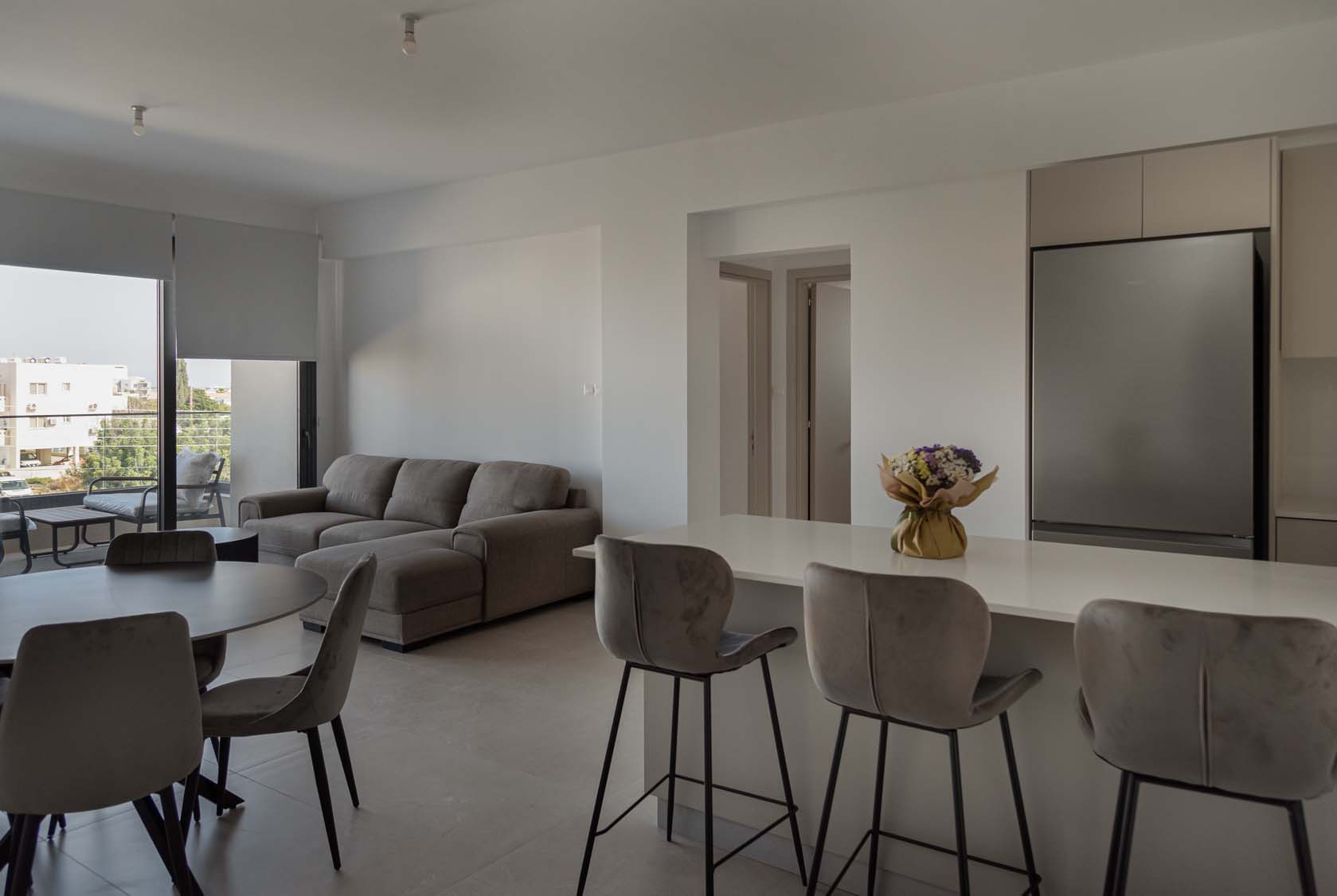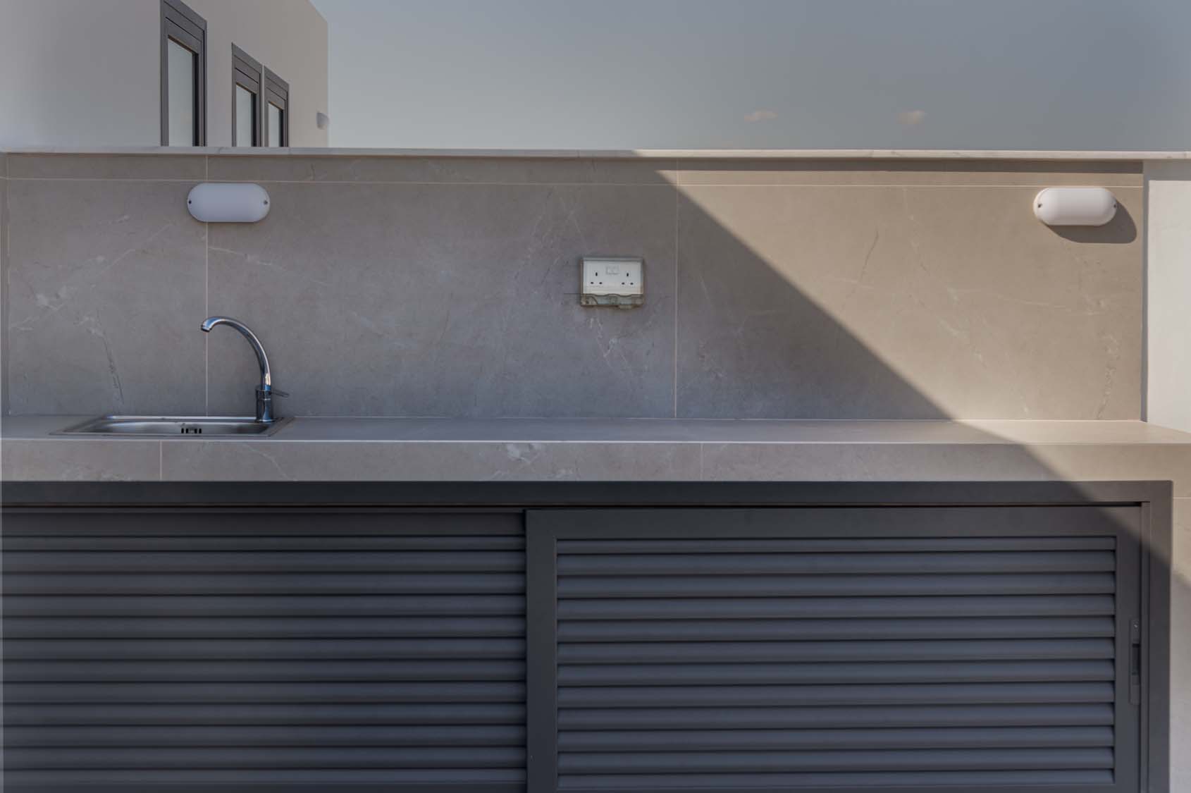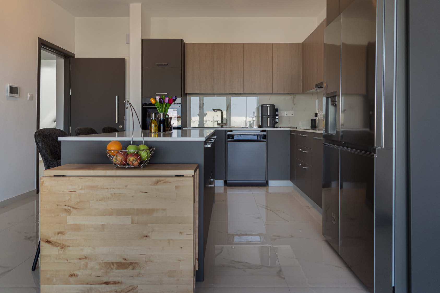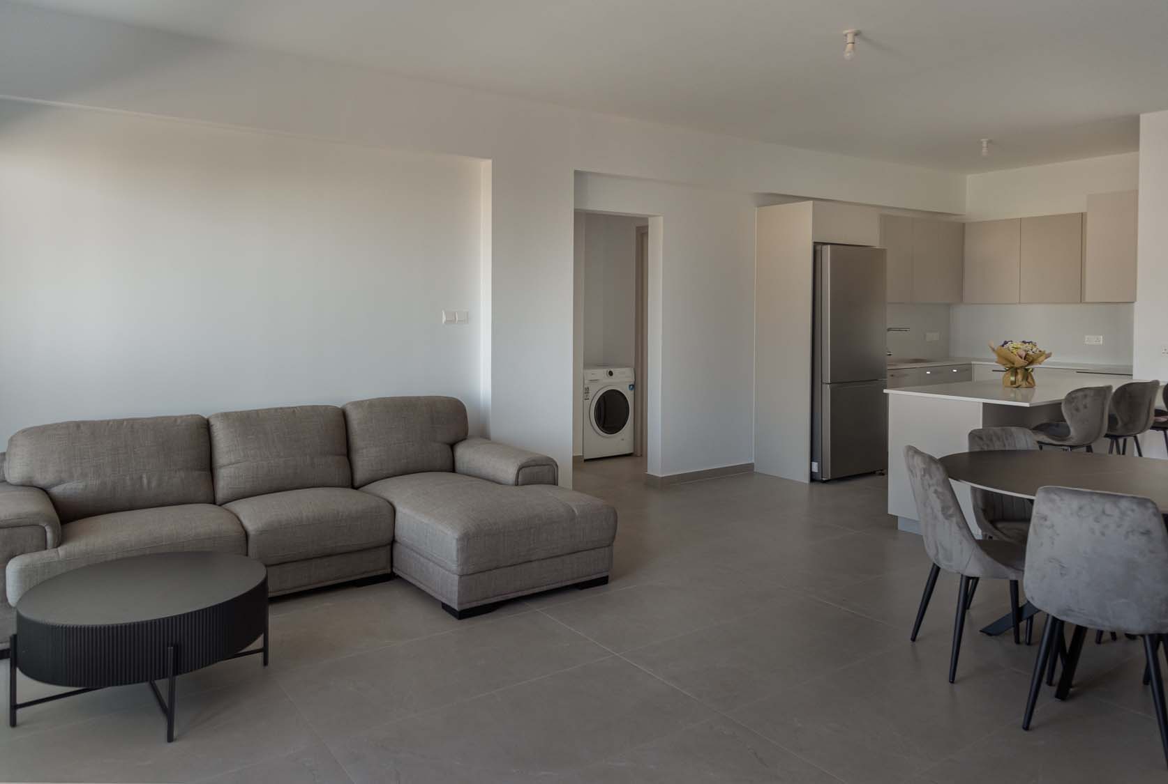 Ceramic tiles: EM Verona Marfil Matt 60x120; Kitchen: Light Mocha; Granite: Snow White; Kitchen Mixer: Ravelli 3-way Pull Out; Toilet: Ravelli Riana Back-to-Wall;Bathroom Mixers: Grohe Bauedge Bathroom Accessories: Grohe; Bathroom Cabinets: Vanity Unit White