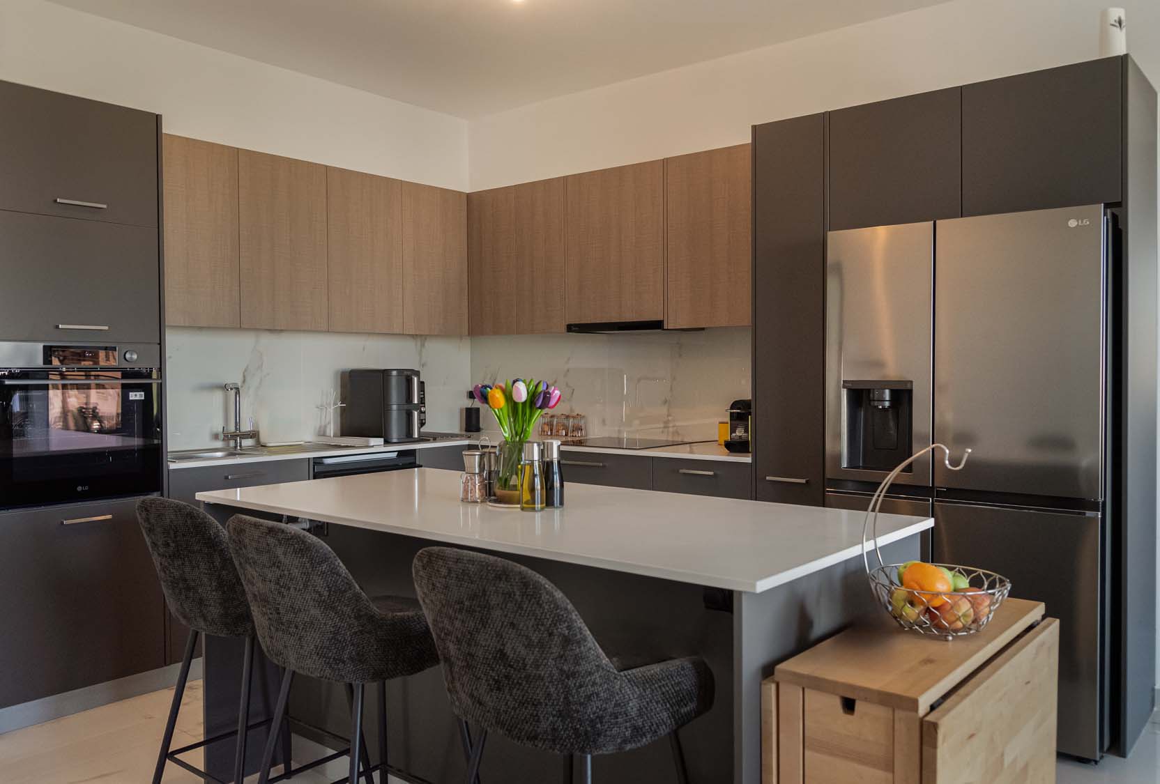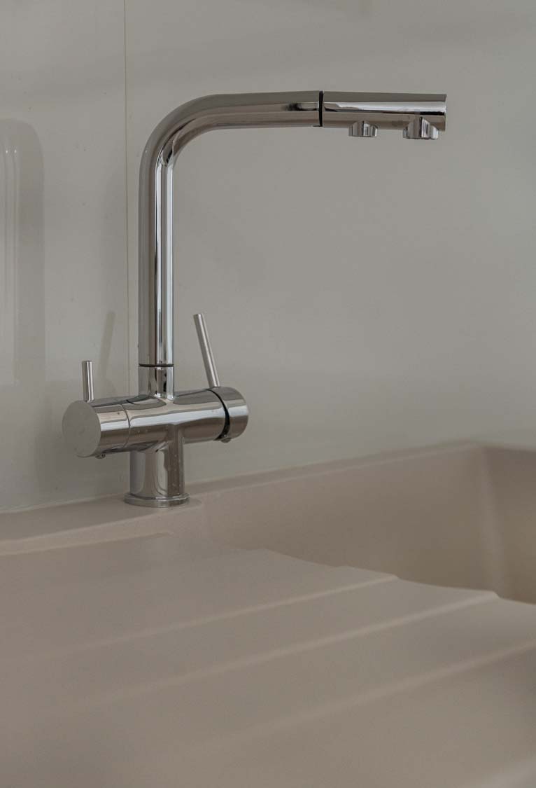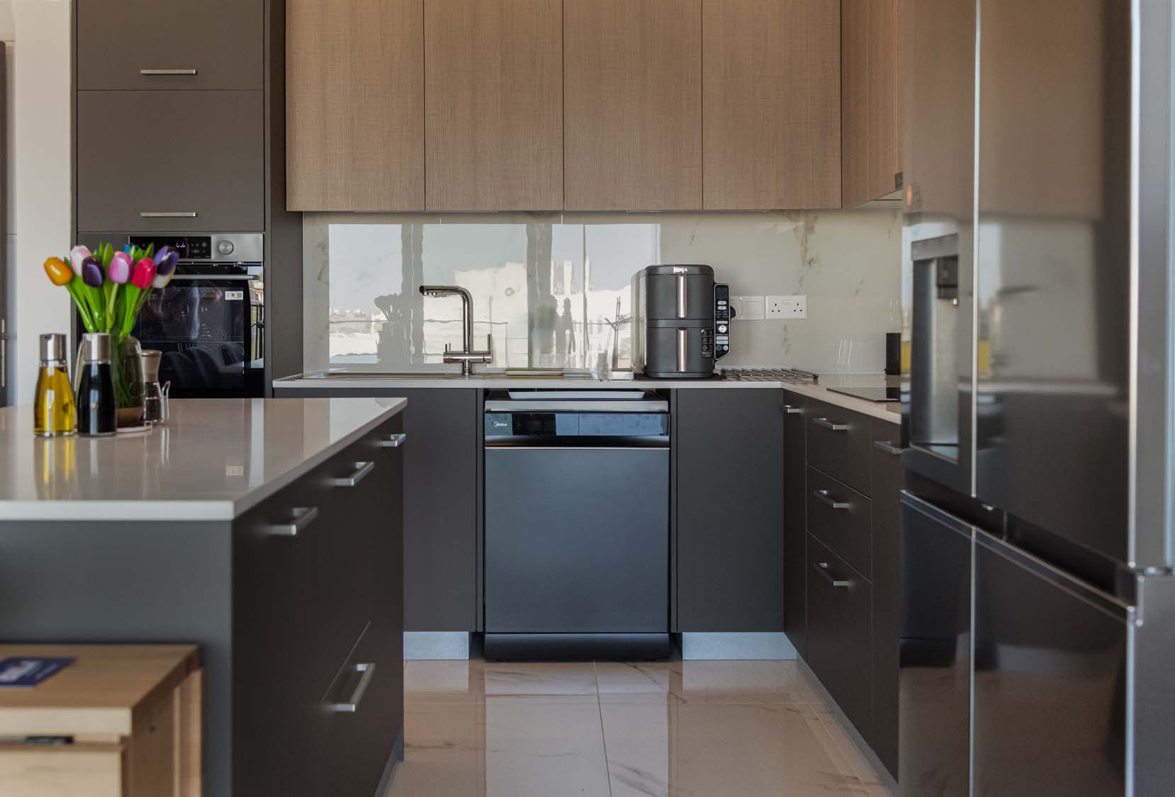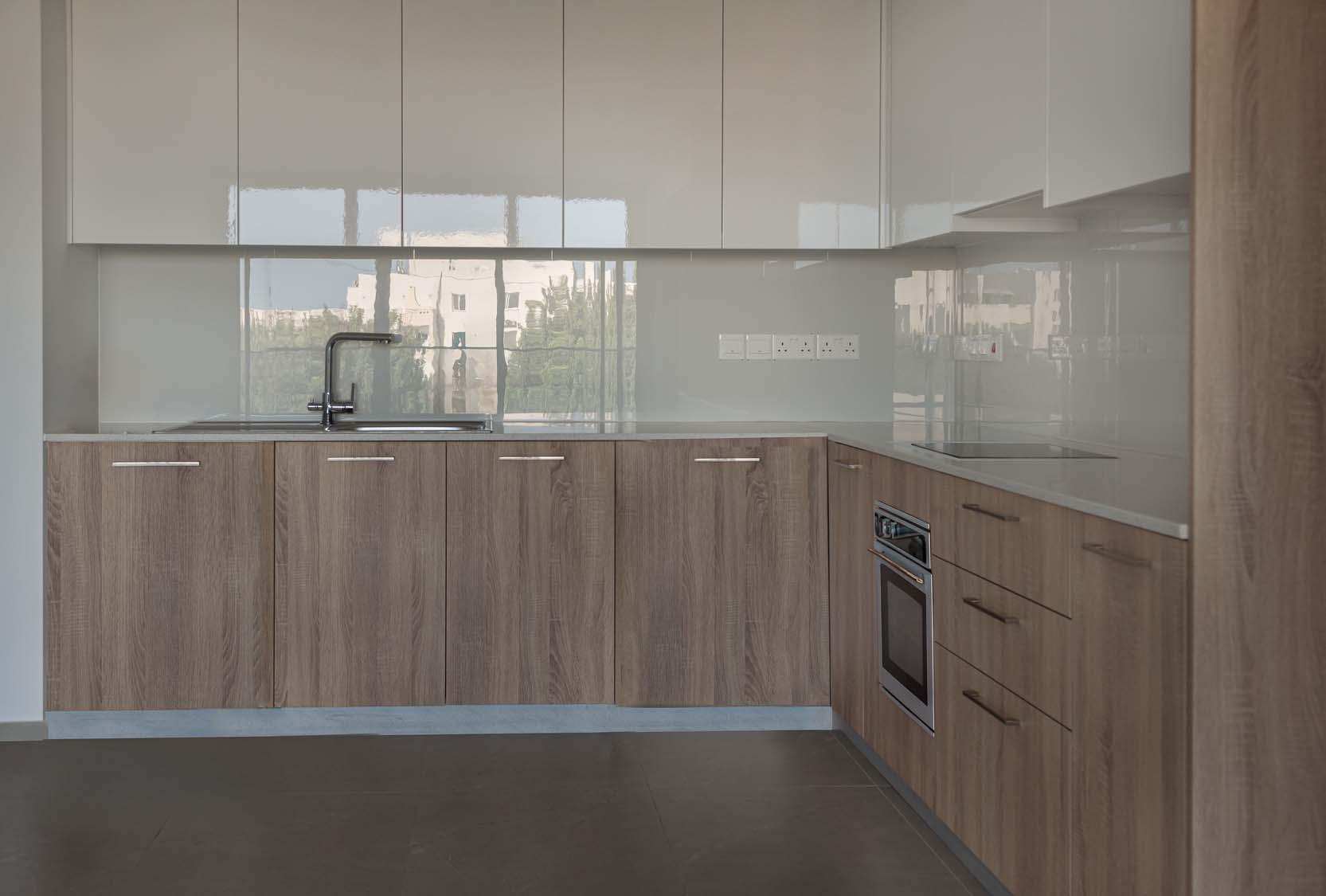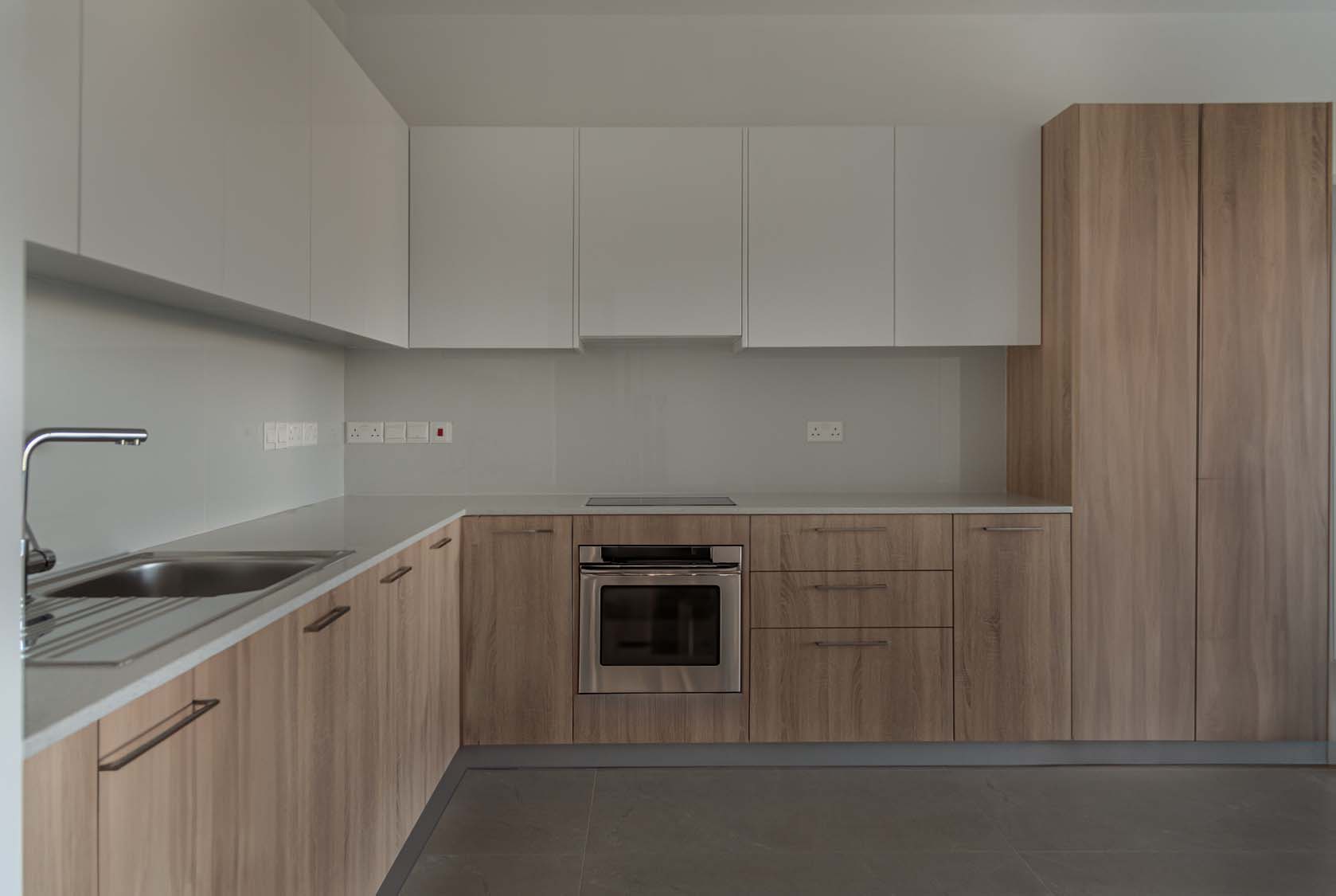 Ceramic tiles: EM Verona Marfil Matt 60x120; Kitchen: White Gloss (Overhead Cabinet) and Light Sonoma (Base Cabinet); Granite: Bianco Luciente; Kitchen Mixer: Ravelli 3-way Pull Out