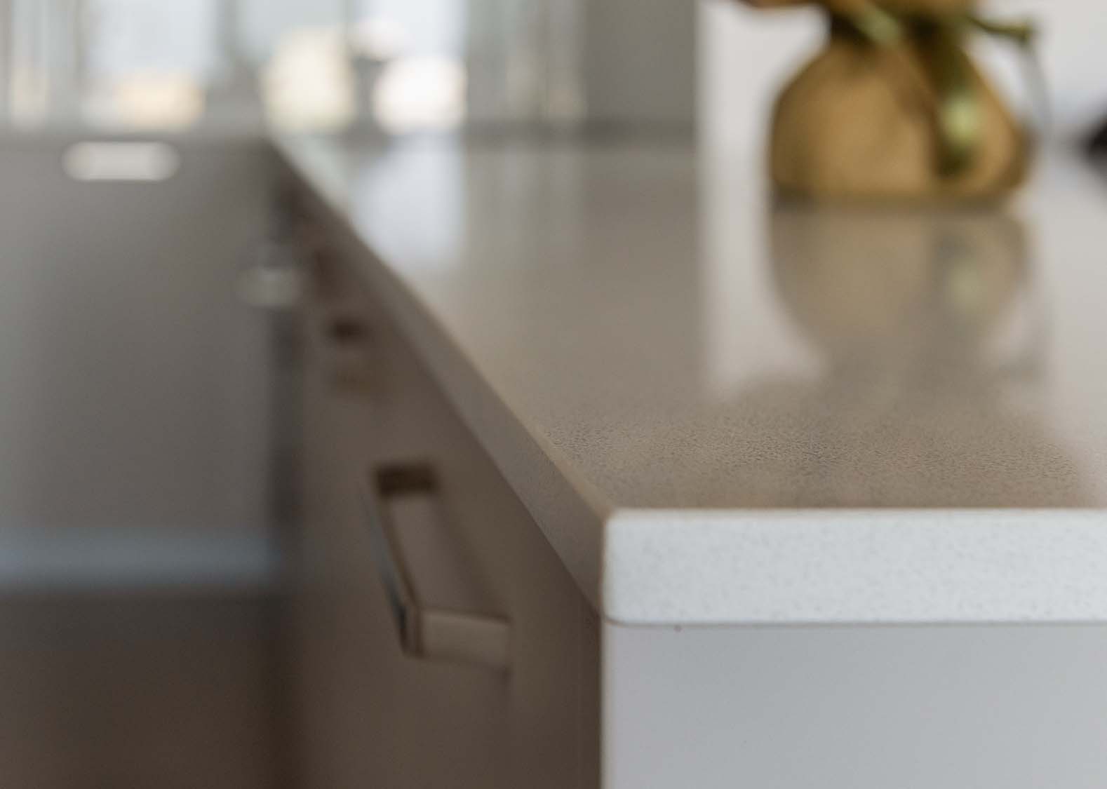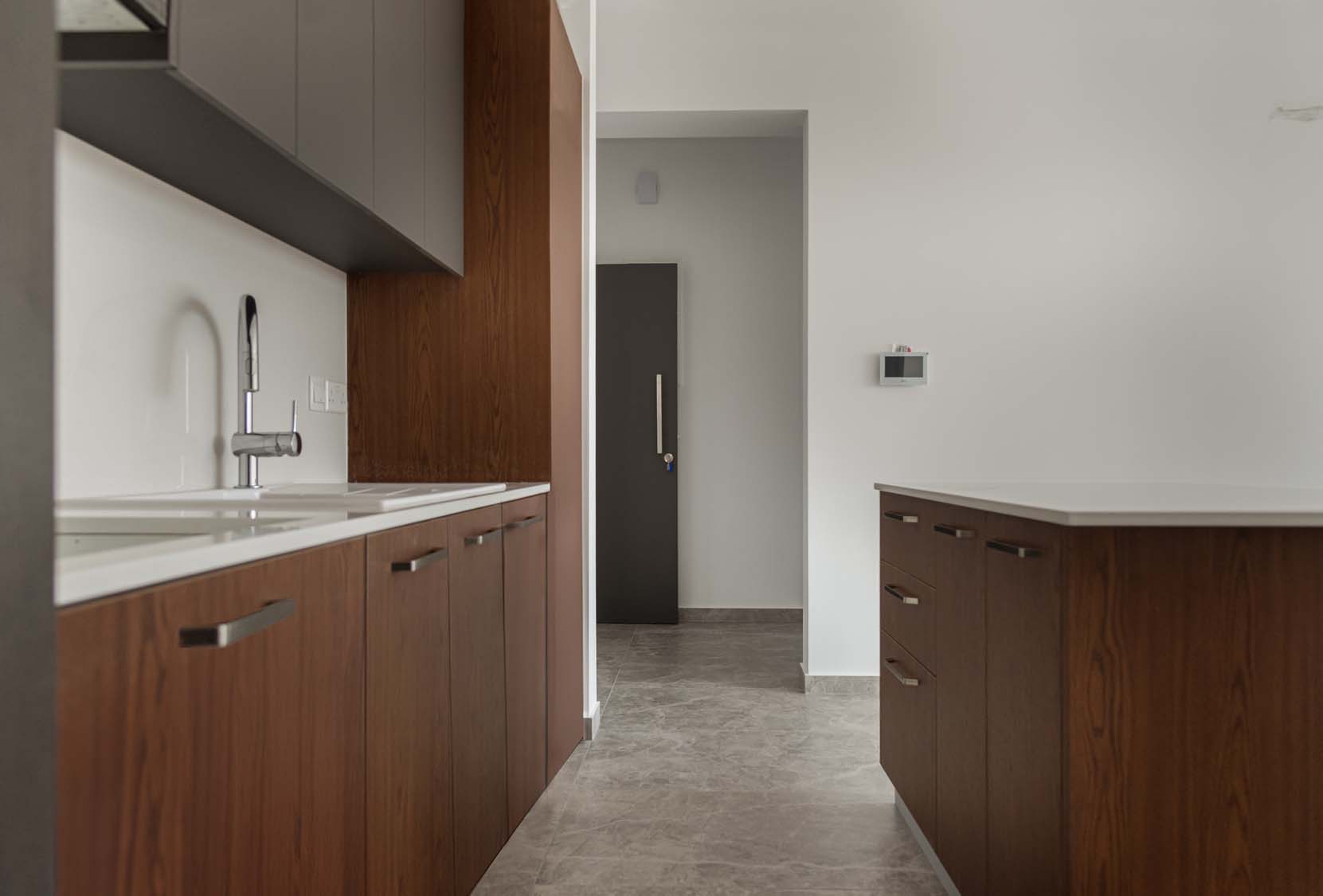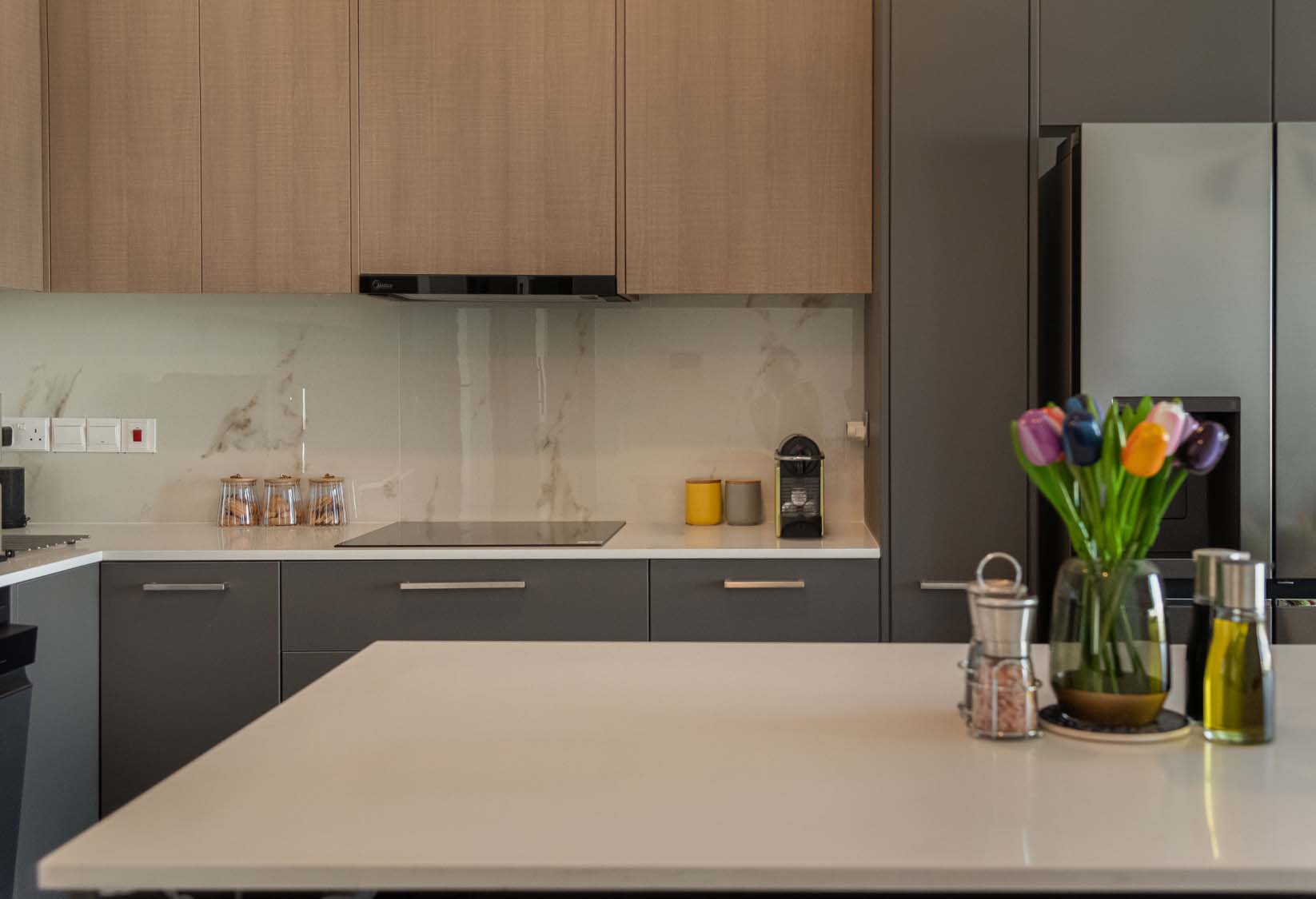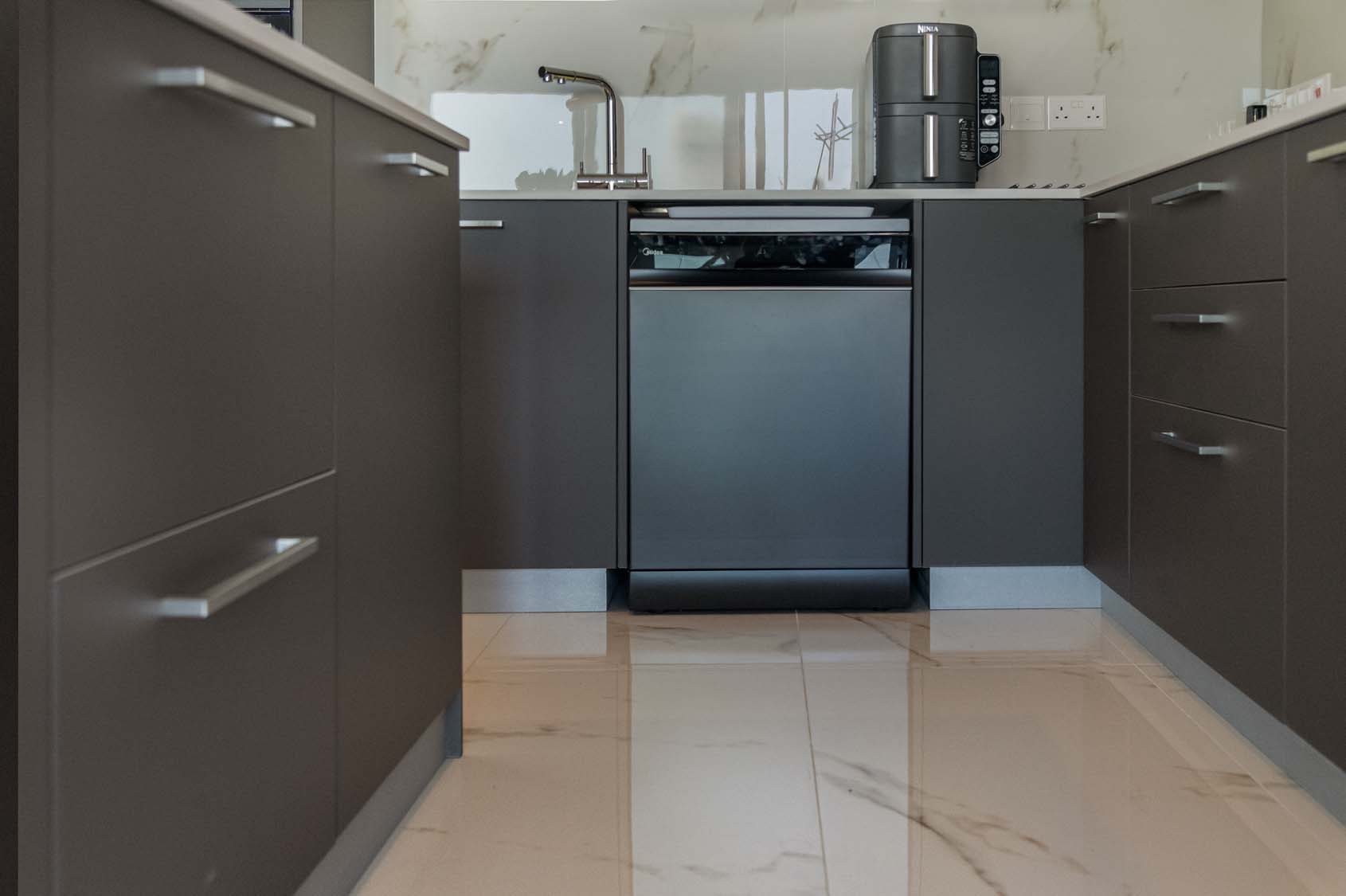Ceramic tiles: EM Calacatta Gold Shiny 60x120; Kitchen: Dark Perrier (Overhead Cabinet) and Grey Matt (Base Cabinet); Granite: Snow White; Kitchen Mixer: Ravelli 3-way Pull Out